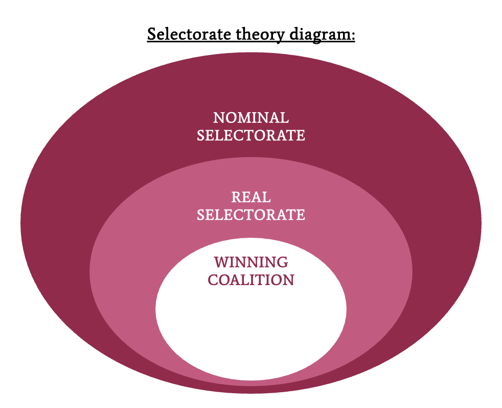 The first section; the nominal selectorate, including “every person who has at least some legal say in choosing their leader.” This section of the population is also termed ‘the interchangeables’, in this case referring to all eligible voters who merely have “a toe in the political door”, as if a few of them were lost or switched out, it would be inconsequential in the broader context.